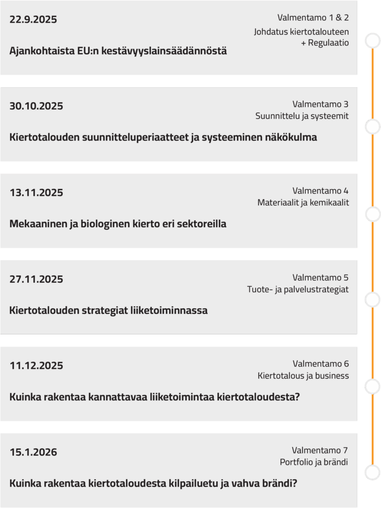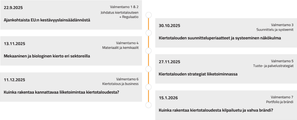 Aloitamme syyskuussa Kiertotalousvauhdittamossa pk-yrityksille suunnatun maksuttoman valmennuksen, jossa hyödynnetään Design Forum Finlandin Circular Design for Business verkkokurssia. Suoritamme kurssia yhdessä vaihe vaiheelta, ja syvennymme työpajoissa yhteen kurssin teemaan kerrallaan. Luvassa on mielenkiintoisia asiantuntijapuheenvuoroja, jotka syventävät kurssin teemaa sekä yhteistä pohdiskelua aiheesta. Kiertotalousvauhdittamon valmennuksen myötä saat palapalalta suoritettua kurssin ja saat siitä todistuksen.